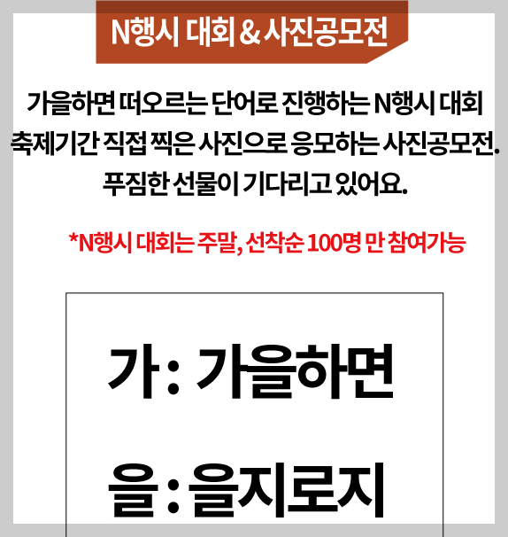 가을하면 떠오르는 단어로 N행시를 짓는 대회이며, 축제기간 동안 찍은 사진을 응모하는 사진공모전과 함께 푸짐한 선물도 마련되어 있답니다.