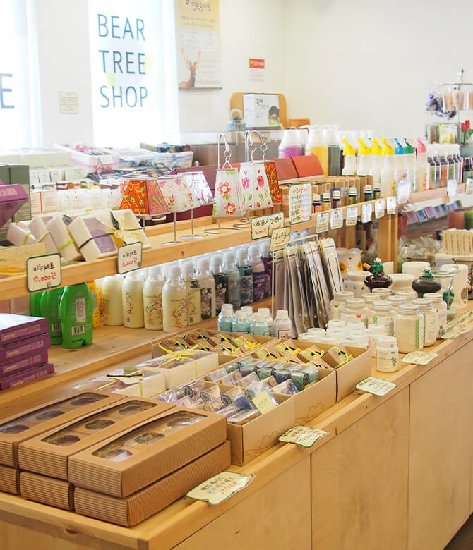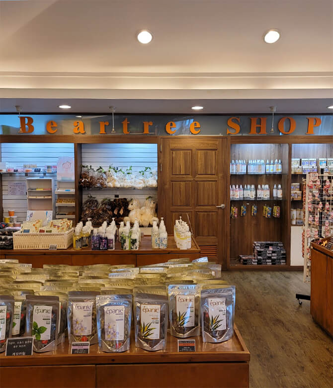 베어트리샵은 다양한 기념품과 음료를 판매하고 있어요. 또한 꽃과 식물의 향기를 담은 아로마, 허브제품, 액세서리, 생활용품들이 준비되어 있습니다.