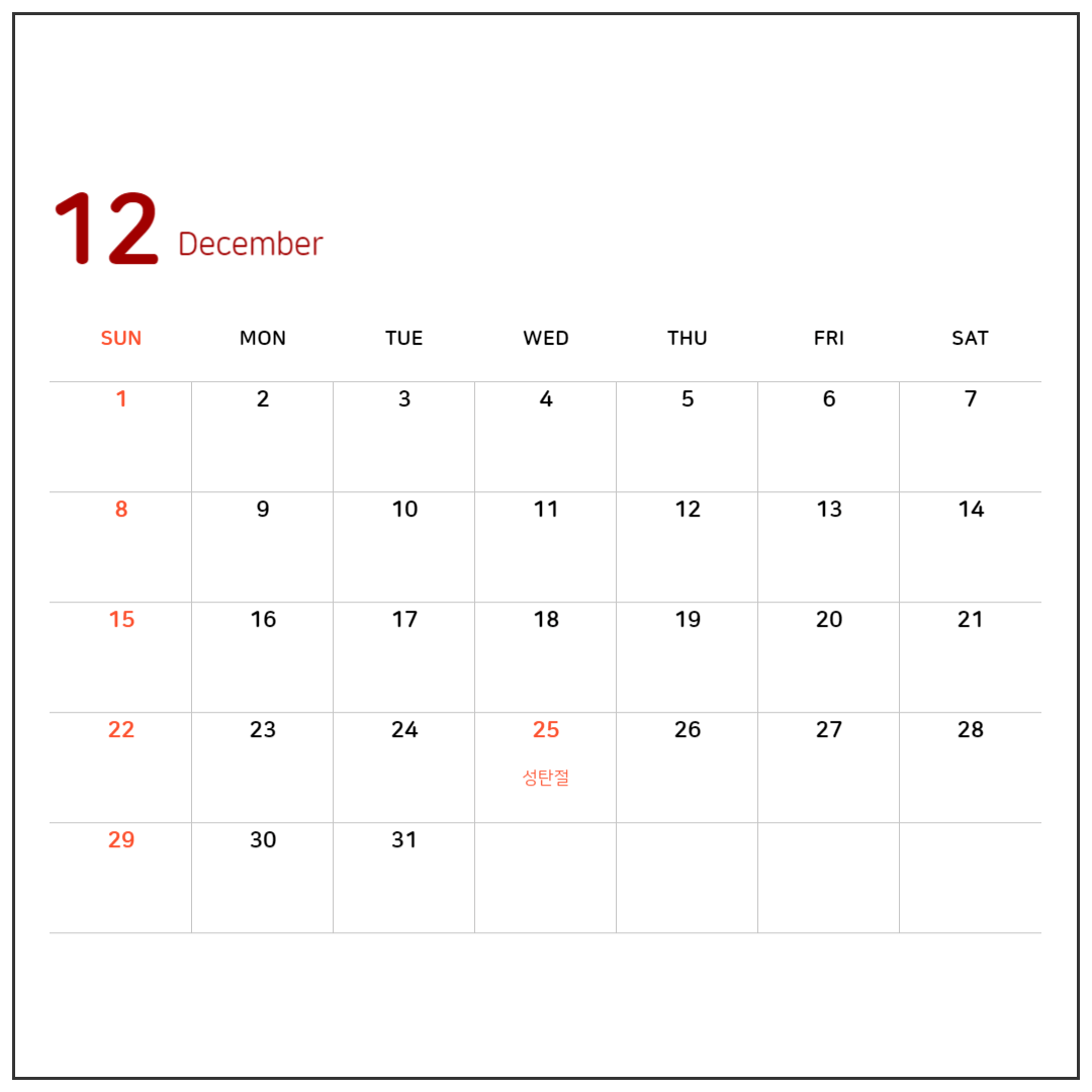 한해를 마무리하는 12월은 모두들 정신없이 바쁜 달이기도 하지요. 마무리도 하면서 다가오는 새해를 맞이할 설렘도 함께 느낄 수 있는 달이기도 합니다. 이달은 12월 25일 성탄절날 쉬면서 한해를 잘 마무리해 보는 것도 좋을 것 같네요.