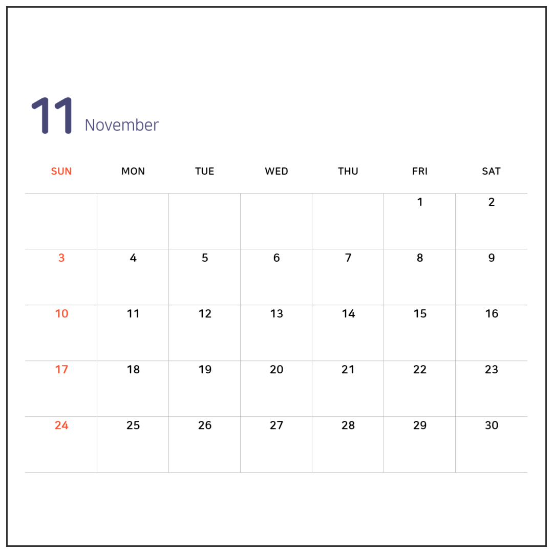 11월은 날씨가 점점 싸늘해지는 달이기도 한데요. 2024년에는 공휴일까지 없습니다. 직장 다니시는 분들은 암울한 마음을 달래기 위해 미리미리 연차 사용하시는게 좋겠네요.