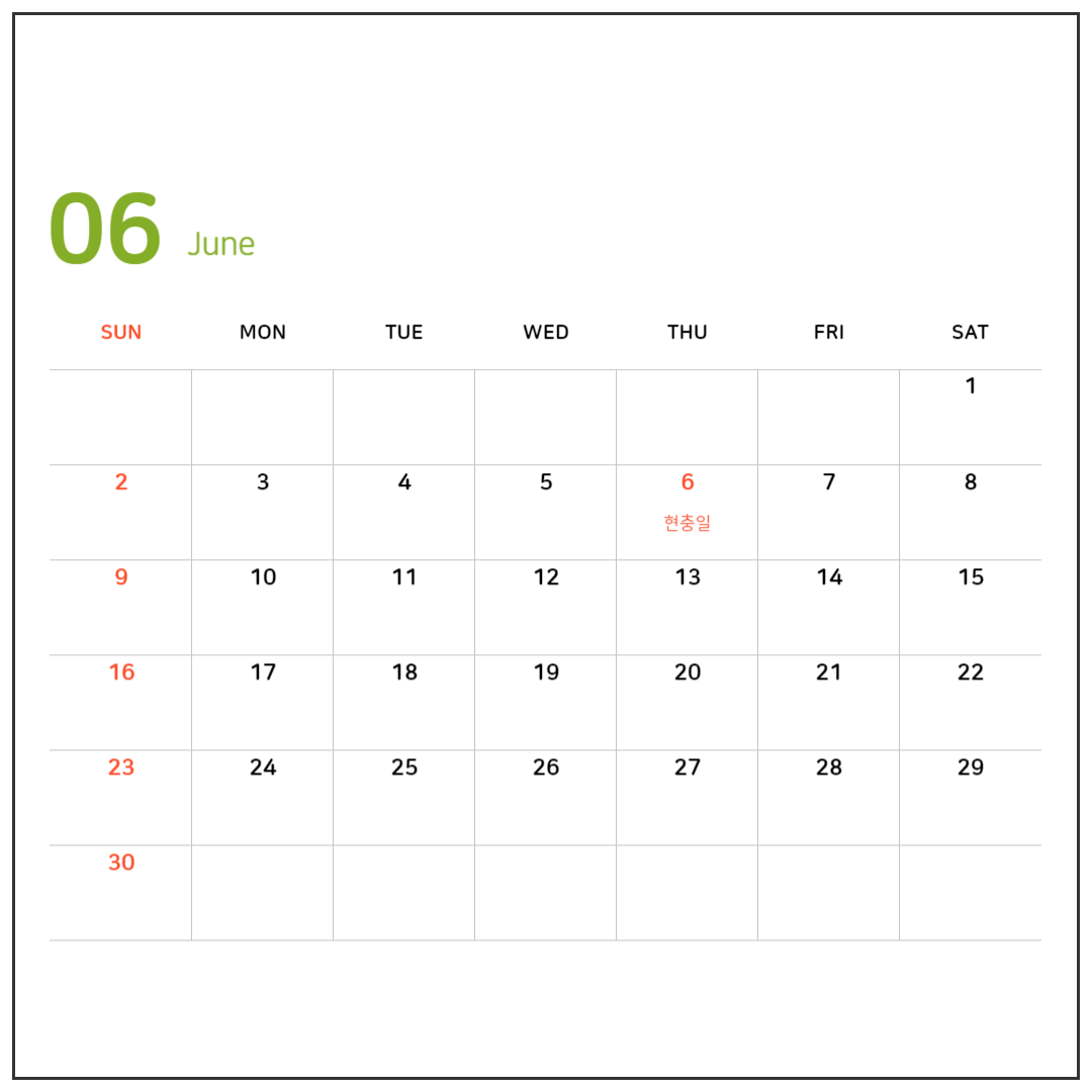 여름이 조금씩 다가오는 달이죠. 이달은 6월 6일 현충일이 공휴일로 빨간날이네요. 목요일이라서 금요일 연차를 낸다면 목, 금, 토, 일 무려 4일간을 연휴를 보낼 수도 있겠습니다.