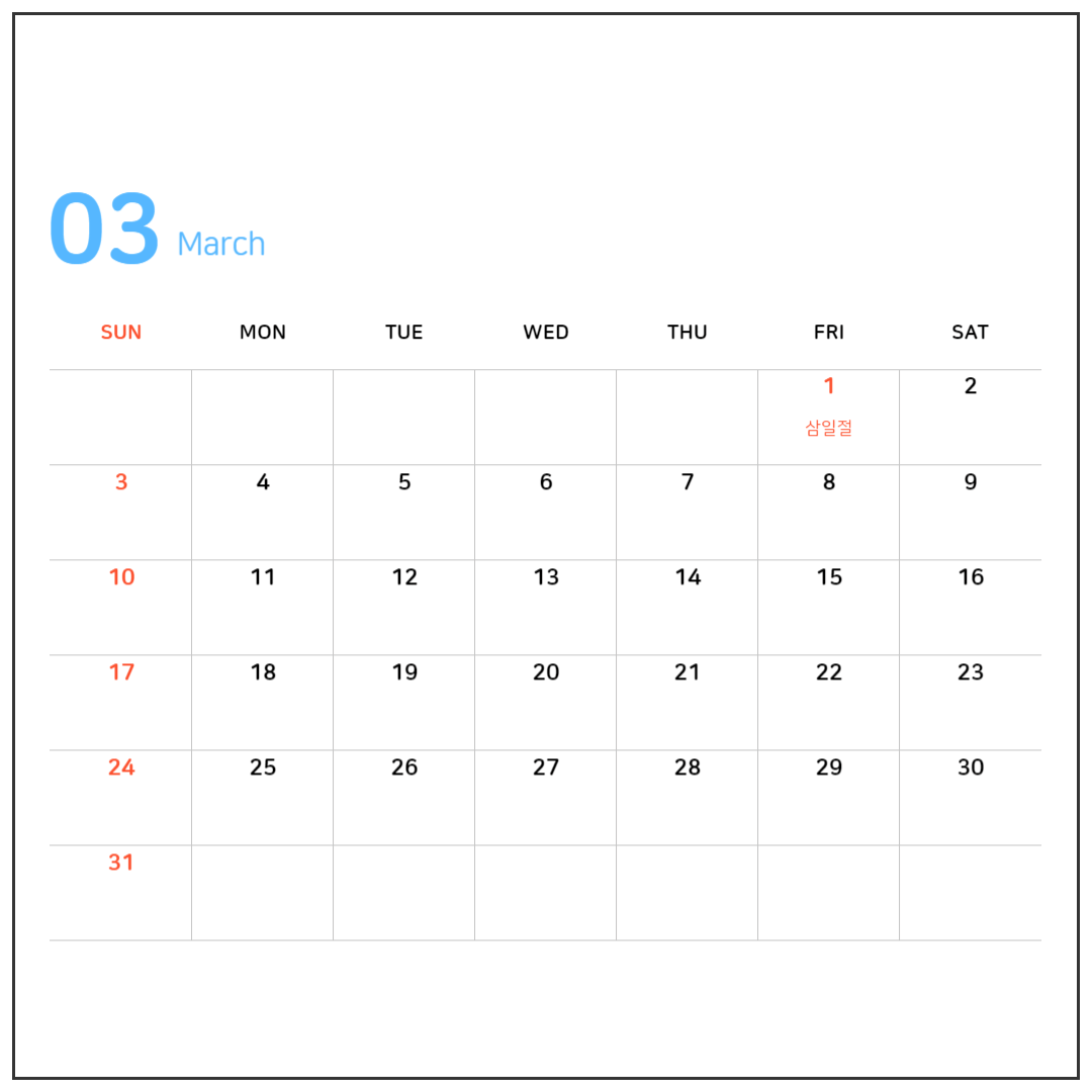 3월도 빨간날이 하루정도이지만 다행히도 3월 1일이 금요일이라서 금, 토, 일 연달아 3일 쉴 수 있습니다.