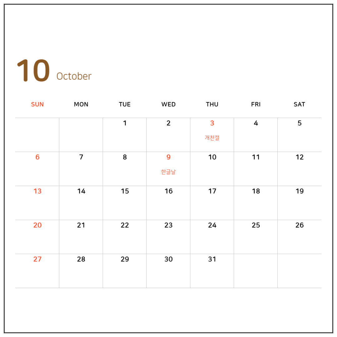 단풍이 붉게 물드는 10월에는 날씨도 덥지 않아서 여행 가기 딱 좋은 달인데요. 10월 3일은 목요일로 금요일 연차내면 토, 일까지 총 4일을 쉴 수 있기 때문에 여행을 노려보는 것도 좋겠네요. 그리고 일주일만 지나면 10월 9일 한글날도 쉬는 날이니 연차도 잘 조정해서 사용해 보는 것도 좋을 것 같습니다.