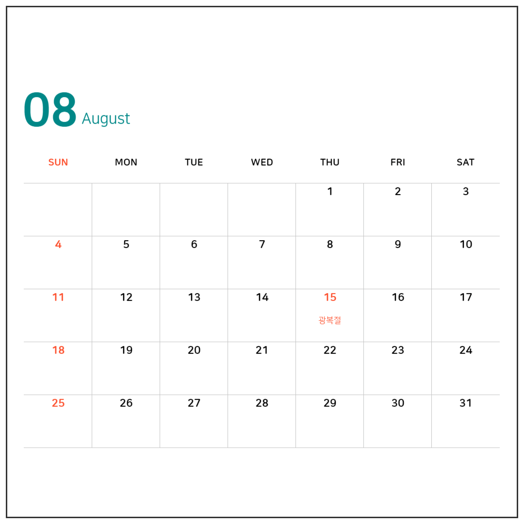 8월은 여름 끝자락이기도 하지만 이달에 휴가를 많이 떠나시는 분들도 많더라고요. 공휴일은 8월 15일 광복절이 빨간날로 쉴 수 있고요. 목요일이라서 금요일날 연차를 내고 목, 금, 토, 일 총 4일의 휴일을 맞이할 수 있답니다.