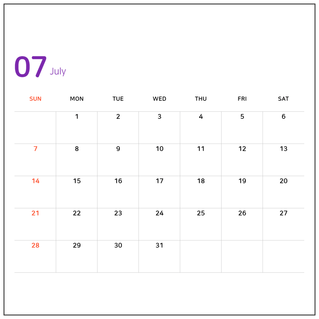 본격적인 여름을 알리는 달이죠. 이달은 여행도 많이 가는 달이지만 아쉽게도 공휴일은 없습니다. 7월이라서 따로 연차를 쓰거나 휴가를 내서 여름을 즐겁게 보내는 건 어떨까요?